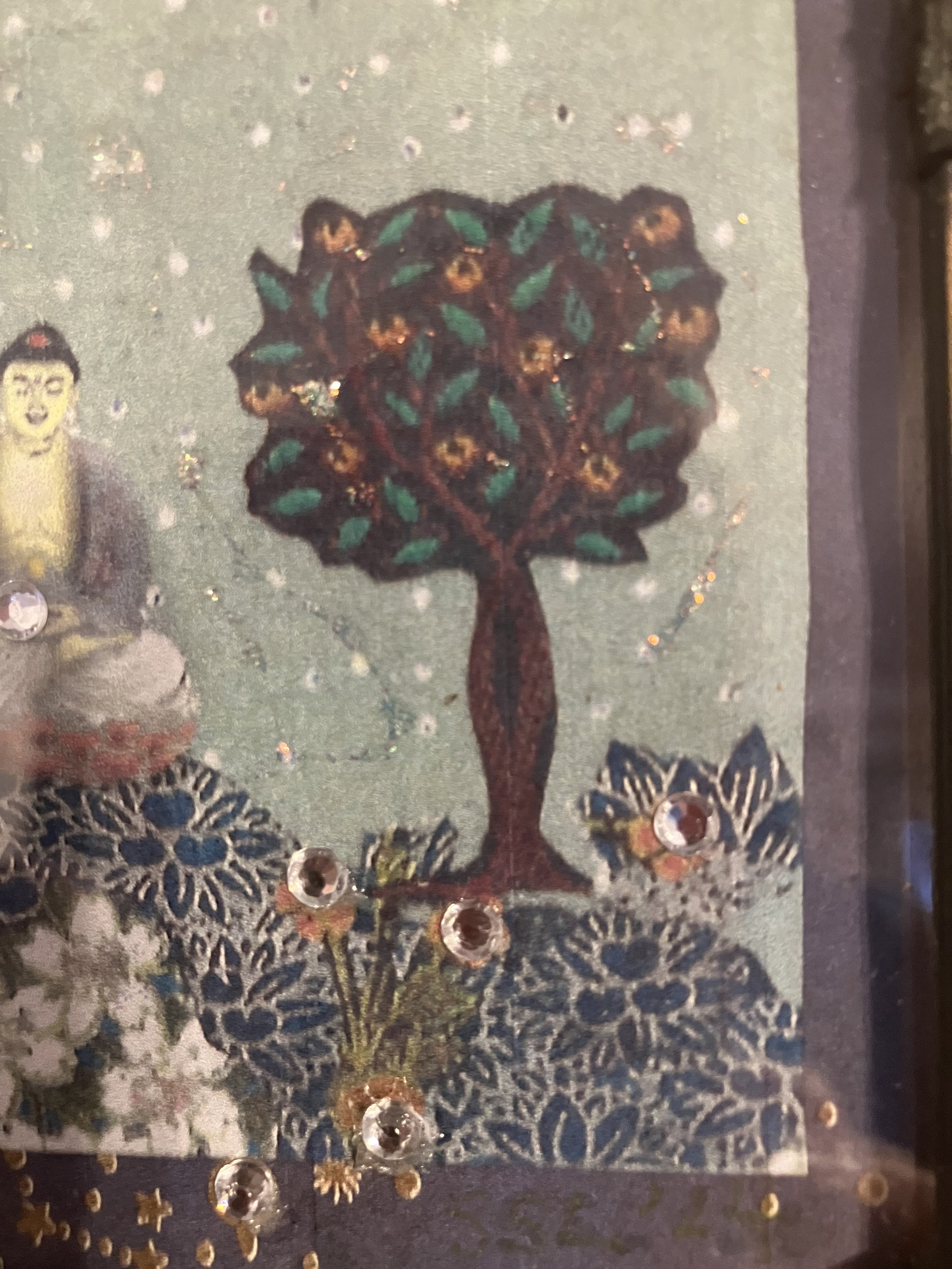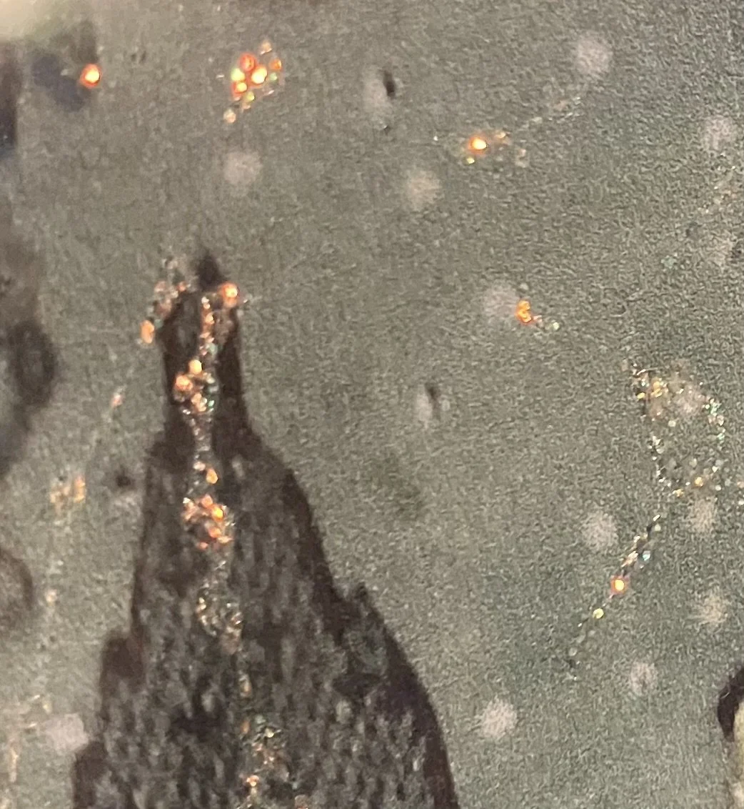 The photos do not well capture the sparkling embellishments of this piece. Glitter and rhinestones are strategically placed to enhance it’s details to beautiful effect.