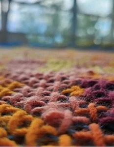 A stepping stone installation inspired by cross stitch, and a current large tapestry that is in progress.